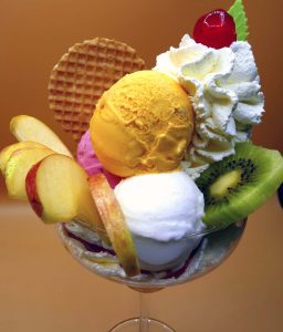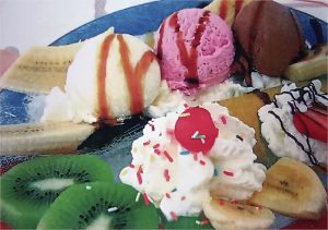 helados de vainilla, chocolate y fresa, fruta natural, nata montada y siropes.
