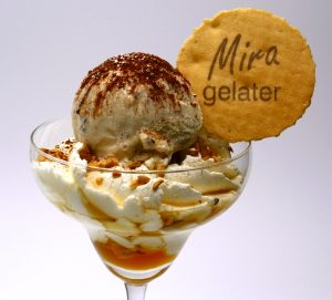 helados de Avellana, stracciatella y mantecado con nata montada, frutos secos y caramelo.