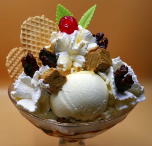 helados de vainilla, chocolate y fresa, fruta natural, nata montada y siropes.